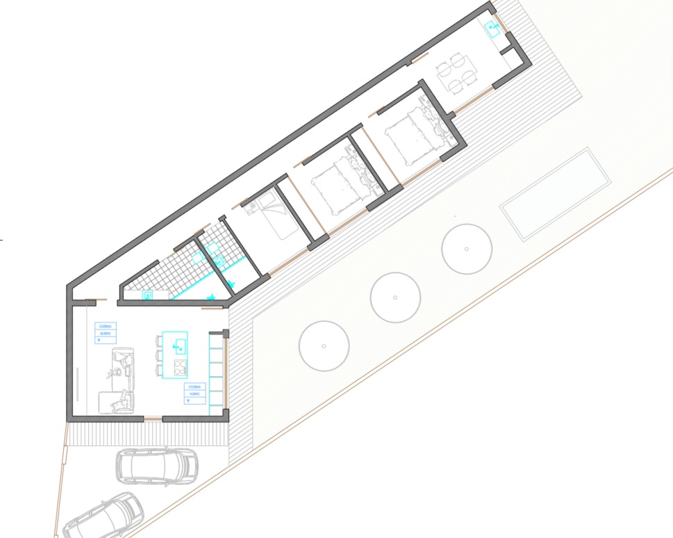 - Architectural project: 3-bedroom villa with large social areas, strong indoor-outdoor connections and swimming pool oriented towards maximum sun exposure